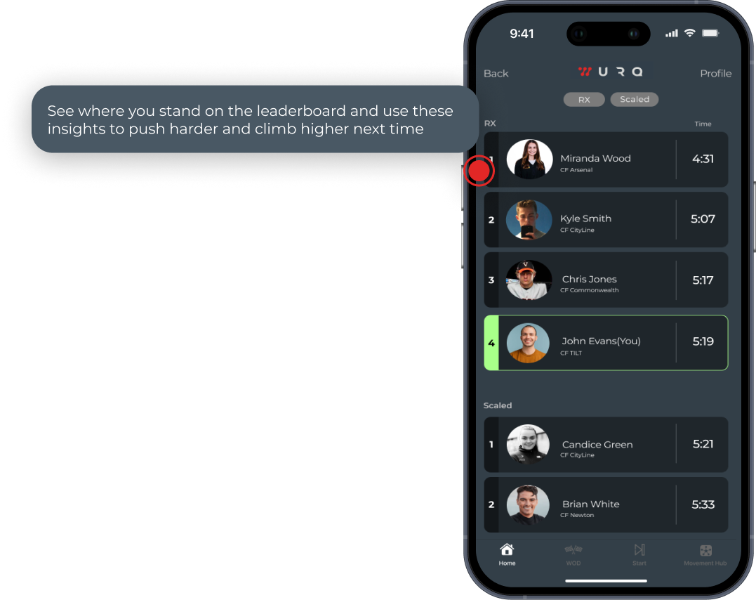 The WurQ leaderboard lets you see where you rank against others who completed the same workout. Seperate leaderboards are available for RX and scaled versions